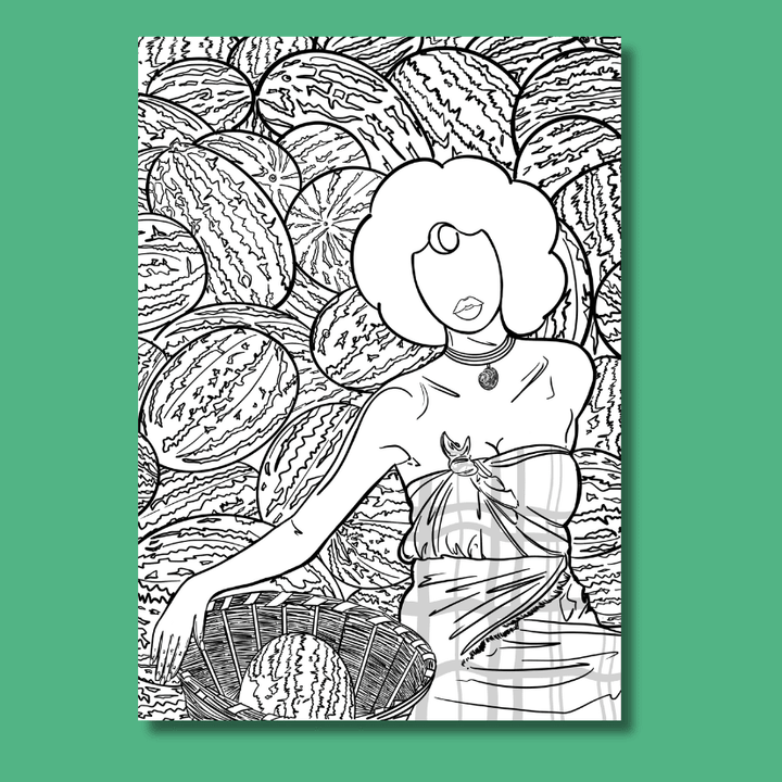 Sous un ciel éclatant et entourée de pastèques gorgées de soleil, une femme élégante savoure un instant simple et joyeux. Drapée dans une robe en madras, symbole fort de l’héritage caribéen, elle incarne la beauté et la fierté d’une culture vivante.